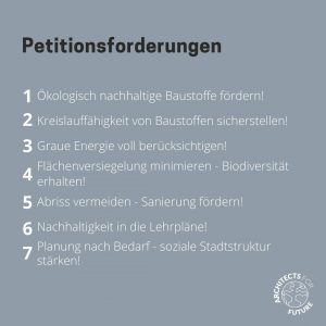 Die Petition der Architects for Future forderte eine klimagerechte, ökologisch und sozial nachhaltige BAUWENDE. Das Bauen und Betreiben von Gebäuden hat weltweit den größten Anteil am Klimawandel. Um die Pariser Klimaziele noch zu erreichen, müssen wir JETZT handeln. Am 1. März hat eine Anhörung im Petitionsausschuß im Bundestag stattgefunden, wo die Antragsteller Gelegenheit hatten, die Forderungen zu begründen. Das ist eine Übersicht der Forderungen: